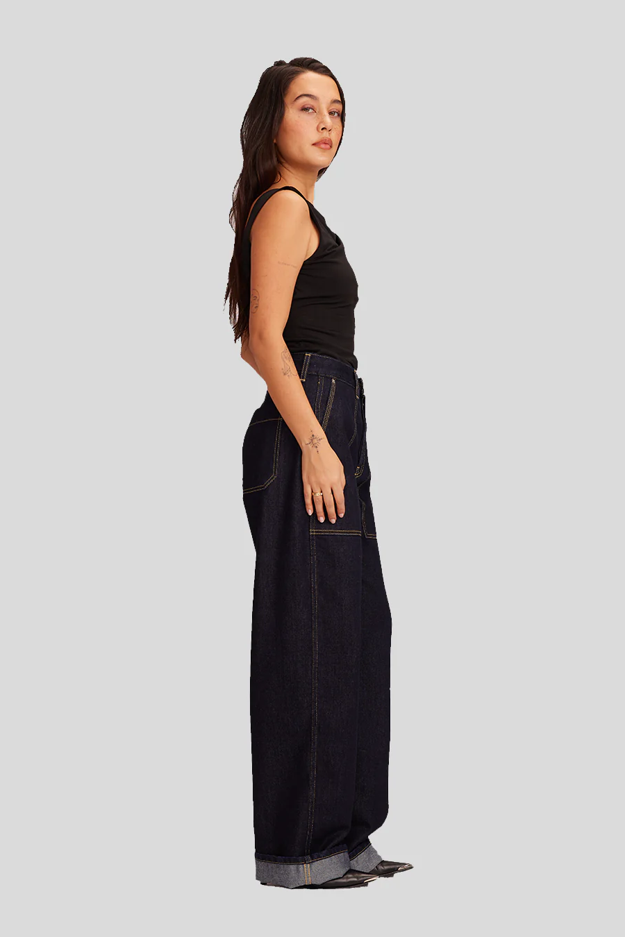 Anson sits high at the waist and easy through the rise and hips. It is a modern take on utility styling with trouser patch pockets, a gentle barrel leg and 3” cuff. Triple needle top stitching and rivets add to an elevated workwear look.