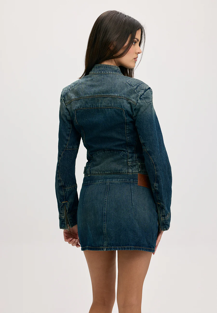 The Siren Jacket hugs your frame with a fitted, waist-nipping silhouette. A fitted biker jacket rendered with subtle whiskering and cut from rigid denim, it sculpts and tailors in all the right places.