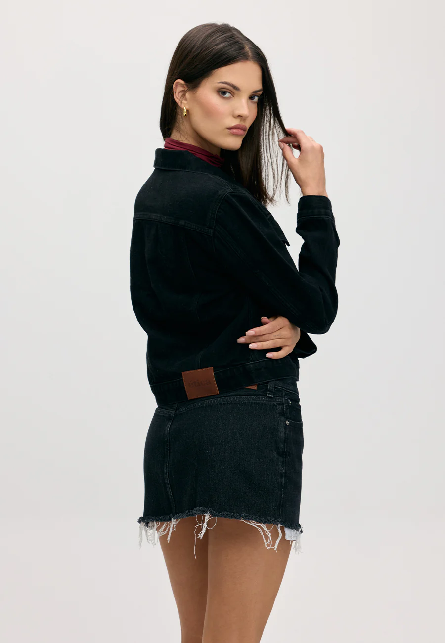 A modern mini skirt with a raw, undone edge. Cut to show a peek of pocketing for that effortless, lived-in feel. Crisp, cool, and ready to style on repeat.